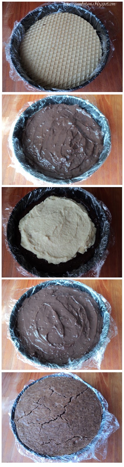 Am decupat foaia mare de napolitană, am aşezat-o în tava de copt acoperită cu hârtie de copt şi am turnat compoziţia pentru blat. Am copt 30 de minute la foc mic în cuptorul preîncins până a trecut testul scobitorii. La prăjitura cu migdale l-am copt identic dar 15 minute. Habar n-am care-i explicaţia!